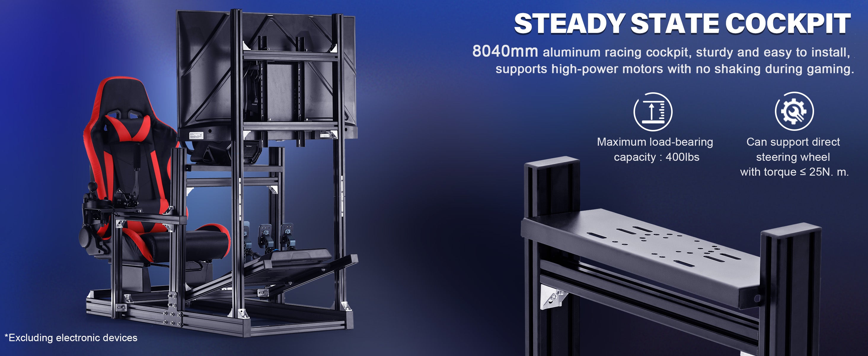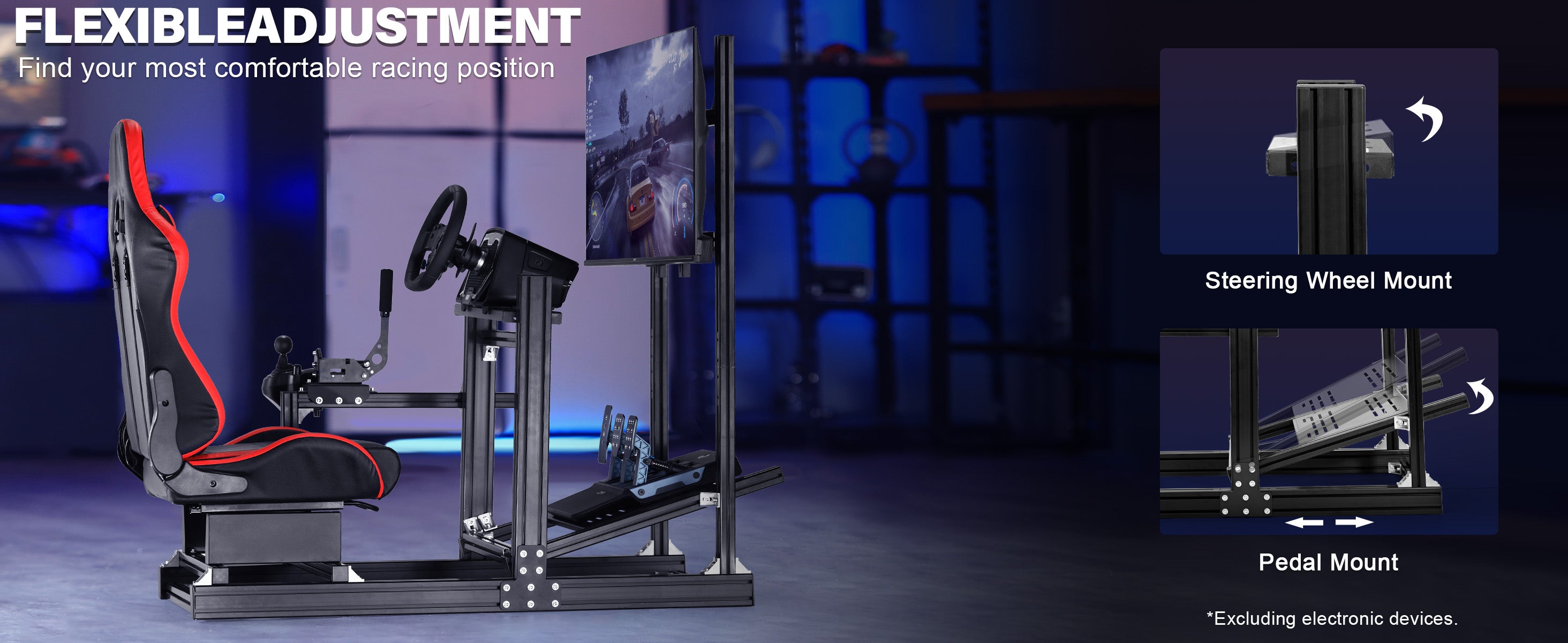 【Integrated Monitor Stand】All-aluminum mount fits 27''–65'' screens, fully adjustable for immersion.