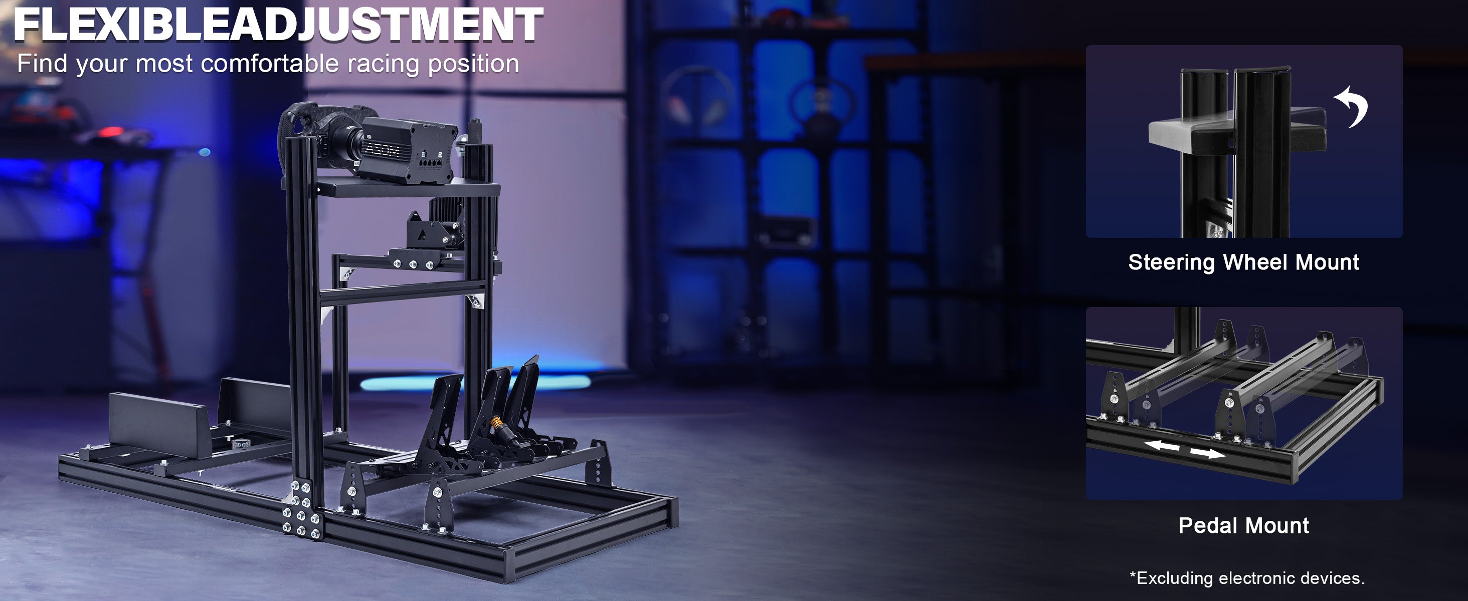 【Continuous Adjustable Layout】Features sliding rails and T-slot profiles for precise positioning of steering wheel, pedals, shifter, and frame components to suit all body types.
