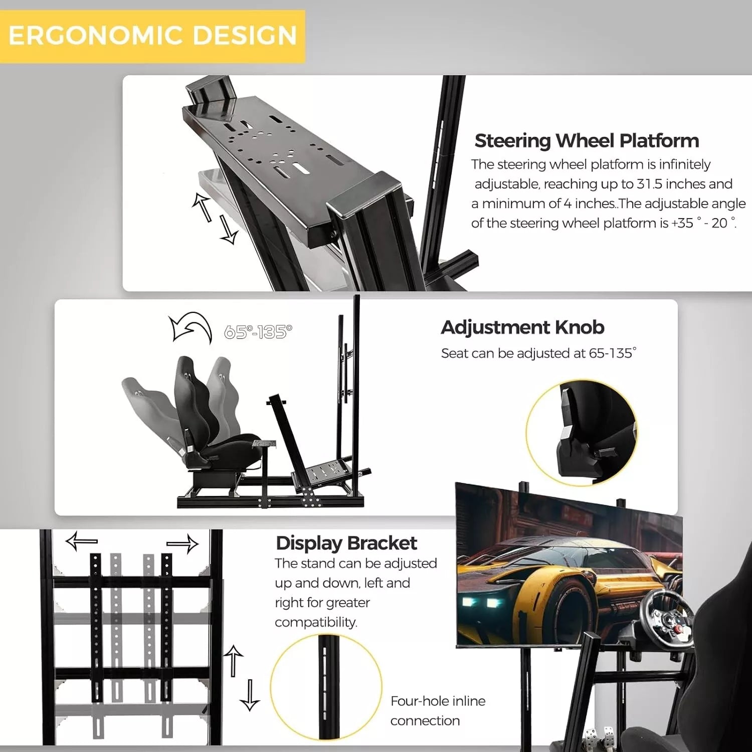 - 【Immersive Experience】This sim racing cockpit has pre-drilled mounting holes for display mounts and can support displays from 27-65 inches. The ergonomic black seat is breathable and won't collapse, bringing you an immersive racing experience